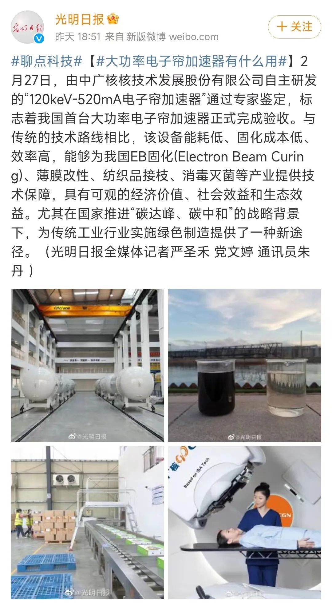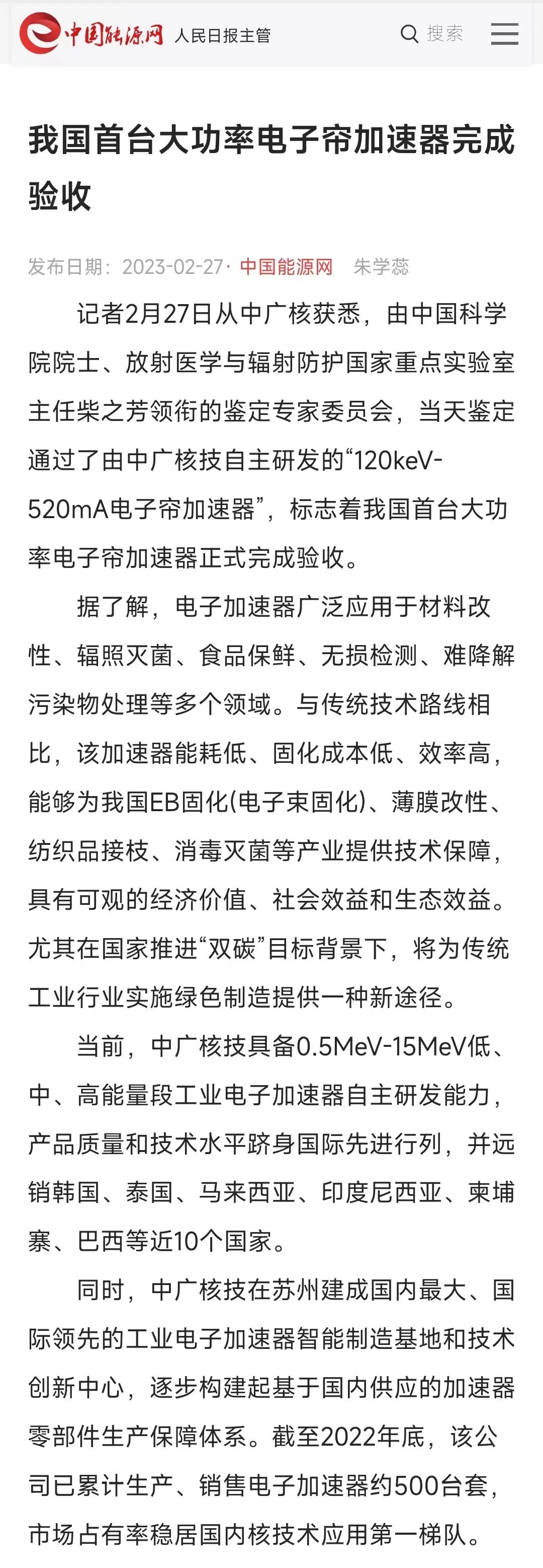 2月27日,由中廣核核技術發展股份有限公司(股票代碼:000881.SZ)聯合中科院近物所研發的“120keV-520mA電子簾加速器”通過專家鑒定。本次鑒定會由同輻行業協會組織,中國科學院院士、放射醫學與輻射防護國家重點實驗室主任柴之芳院士擔任鑒定專家委員會主任,標志著我國首臺大功率電子簾加速器正式完成驗收。與傳統的技術路線相比,該設備能耗低、固化成本低、效率高,能夠為我國EB固化(Electron Beam Curing)、薄膜改性、紡織品接枝、消毒滅菌等產業提供技術保障,具有可觀的經濟價值、社會效益和生態效益。尤其在我國推進“碳達峰、碳中和”的戰略背景下,為傳統工業行業實施綠色制造提供了一種新途徑。