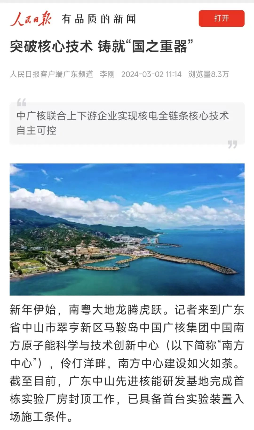 新年伊始,南粵大地龍騰虎躍。記者來(lái)到廣東省中山市翠亨新區(qū)馬鞍島中國(guó)廣核集團(tuán)中國(guó)南方原子能科學(xué)與技術(shù)創(chuàng)新中心(以下簡(jiǎn)稱“南方中心”),伶仃洋畔,南方中心建設(shè)如火如荼。截至目前,廣東中山先進(jìn)核能研發(fā)基地完成首棟實(shí)驗(yàn)廠房封頂工作,已具備首臺(tái)實(shí)驗(yàn)裝置入場(chǎng)施工條件。