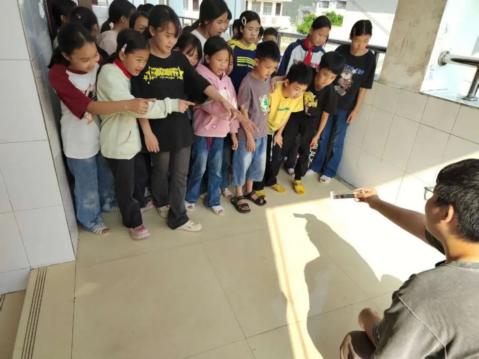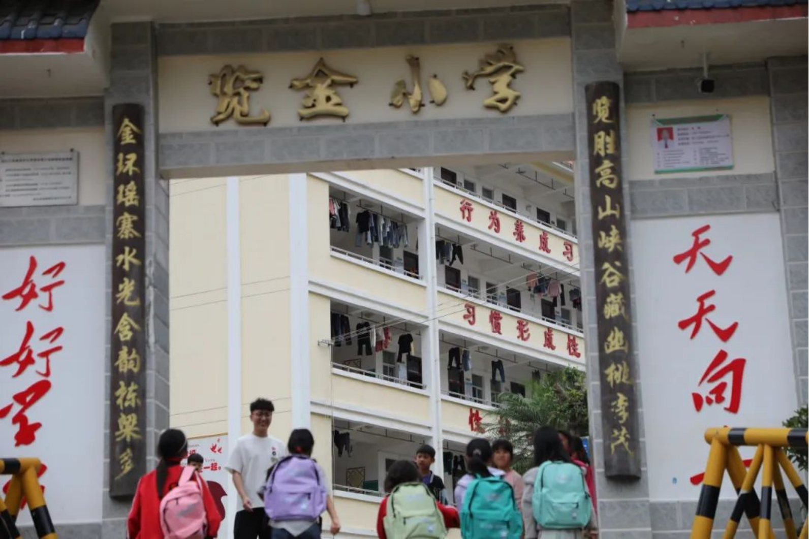 ▲校門口,孩子們背著彩虹項目組捐贈的新書包,與守候多時的支教老師再次重逢