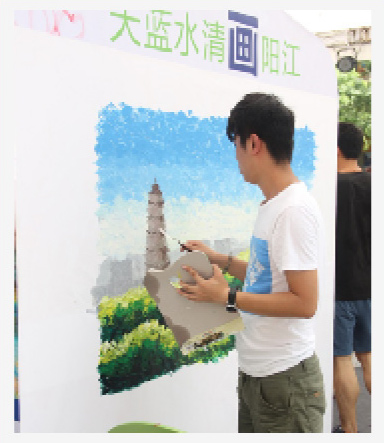 活動邀請了廣州美術學院的學生現場作畫,用水彩描繪陽江的本土特色景色,畫筆下的藍天、北山石塔、靈芝風箏讓市民更直觀的領略到陽江的自然之美